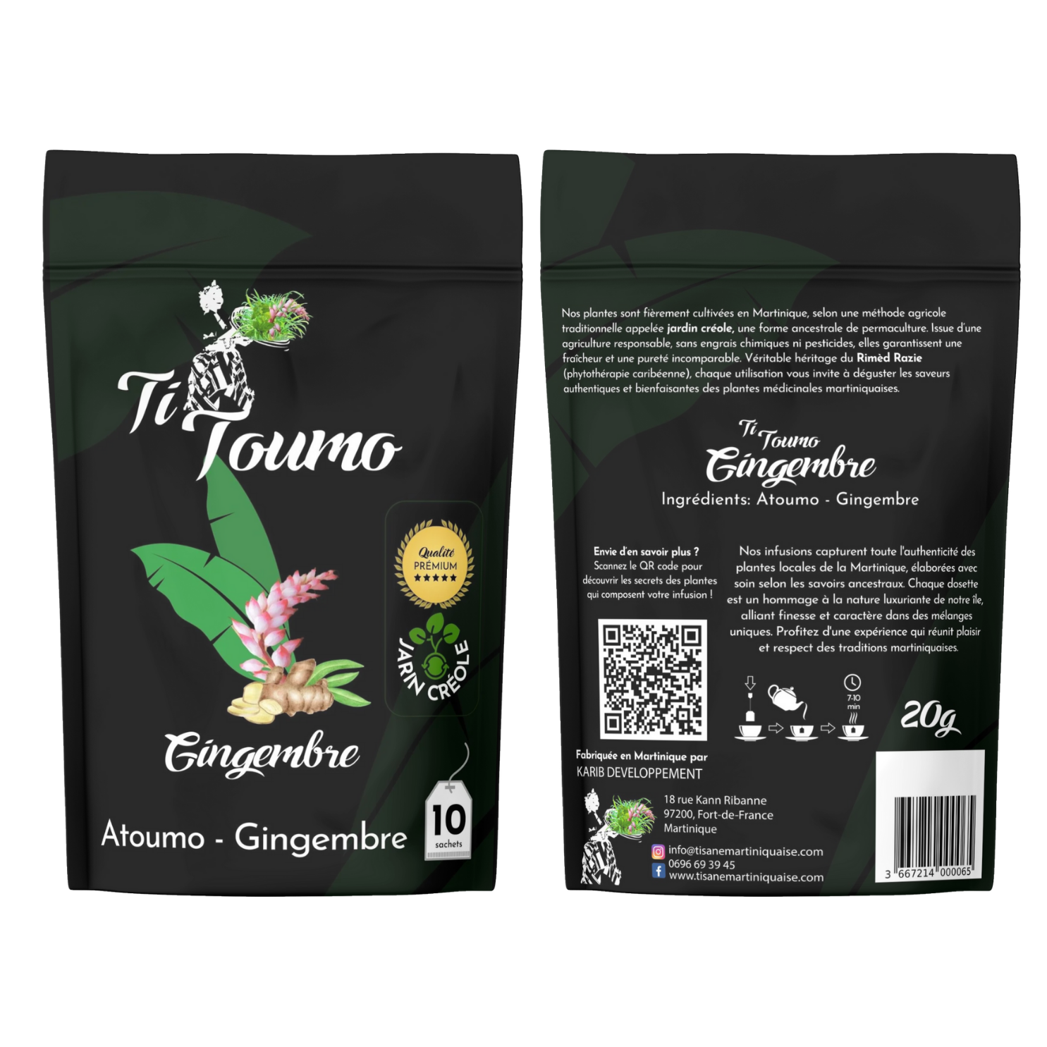 Découvrez Ti Toumo - Atoumo & Gingembre, une infusion au caractère affirmé qui marie l'Atoumo, plante traditionnelle de la culture caribéenne, au gingembre, épice aux notes chaudes et épicées. Un mélange savoureux qui ravit les amateurs de saveurs intenses.
